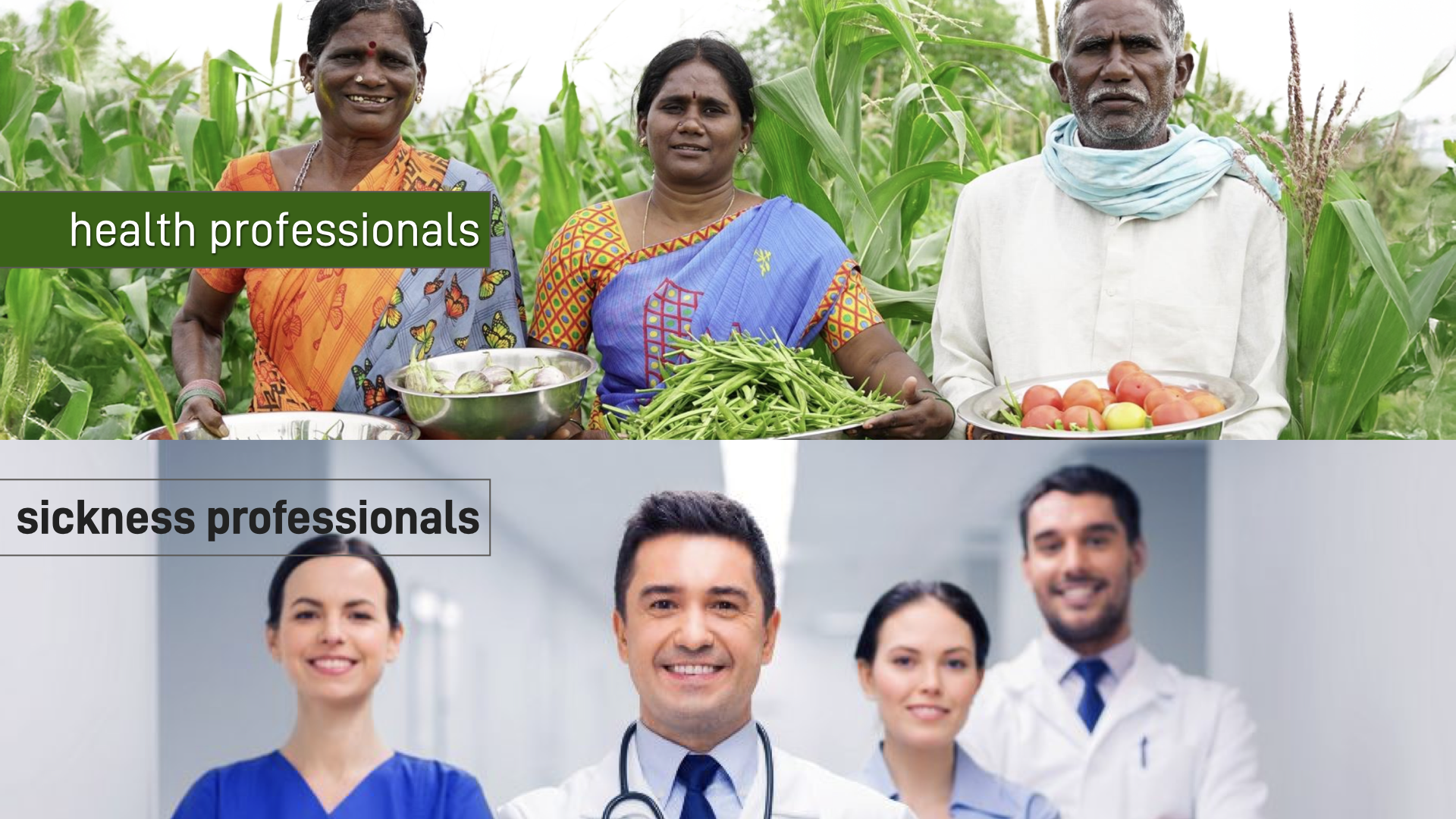 My first proposal in Nukus,was that we call the world’s small farmers, parents, and cooks – who give us good food – “health professionals” – and those running the modern biomedical system, “sickness professionals..